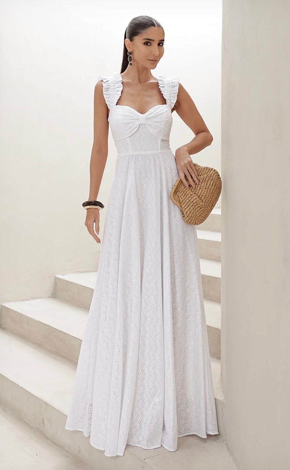 Vestido Longo em Laise com Babados O Vestido Curaçao traduz feminilidade, leveza e romantismo em cada detalhe.Confeccionado em laise delicada, é a escolha perfeita para quem valoriza o charme artesanal aliado à elegância contemporânea. O decote levemente em coração com laço frontal realça o busto de forma sutil e graciosa, enquanto a saia ampla com babados garante movimento e fluidez encantadora. Ideal para madrinhas de dia, casamentos ao ar livre, eventos no campo ou produções sofisticadas de verão, o modelo combina conforto, frescor e sofisticação natural — um verdadeiro clássico atemporal. Detalhes do Produto Alças largas franzidas Decote levemente em formato de coração Detalhe de laço no busto Cintura marcada Saia longa com babados e volume fluido Fechamento em zíper nas costas Possui forro interno Sem bojo Tecido e Composição Tecido: LaiseComposição: 100% Algodão Forro: 100% Poliéster Toque: Macio, leve e agradável, com textura delicada dos bordados característicos da laise.Elasticidade: Baixa — sem elastano, mas com conforto natural do algodão.Caimento: Leve, com fluidez moderada e estrutura suave dos bordados.Visual: Romântico e artesanal, com desenhos vazados florais que transmitem frescor e sofisticação.Durabilidade: Boa — tecido resistente e respirável, com atenção especial aos bordados para preservar o acabamento.